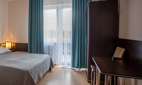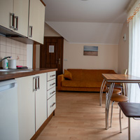 Oferujemy apartamenty rodzinne składające się z sypialni i pokoju dziennego z aneksem kuchennym oraz pokoje dwu i trzyosobowe. Wszystkie pokoje posiadają łazienki z kabiną prysznicową, WC i umywalką. W łazienkach jest suszarka do włosów. W pokojach dziennych jest telewizor z telewizją naziemną.